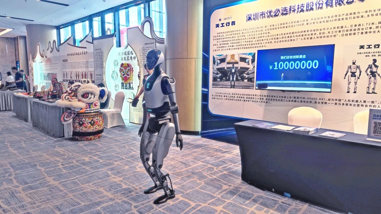 9月27日上午,粤港澳大湾区创业大赛全国总决赛现场的特色展区,人形机器人与非遗醒狮同台展出。(李梦夕 摄)