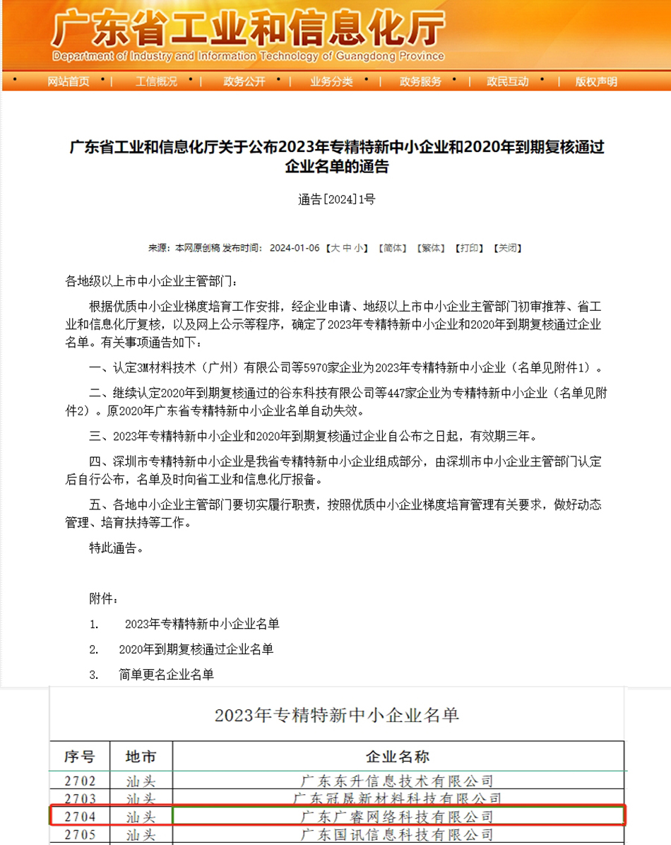 广东广睿网络科技有限公司是汕头高新区企业,是广东省政数局认定的省级信息技术应用创新适配中心,具有国域IDC\ISP\CDN经营许可、信息系统建设和服务能力体系认证、信息技术运行维护服务规范认证等资质。与众多高技术品牌产品建立合作,以信创技术生态为核心,承接信息系统集成工程,提供技术咨询、技术研发、适配测试等服务。企业符合专业化、精细化、特色化、创新化评审标准,2024年1月,获得专精特新中小企业认定。