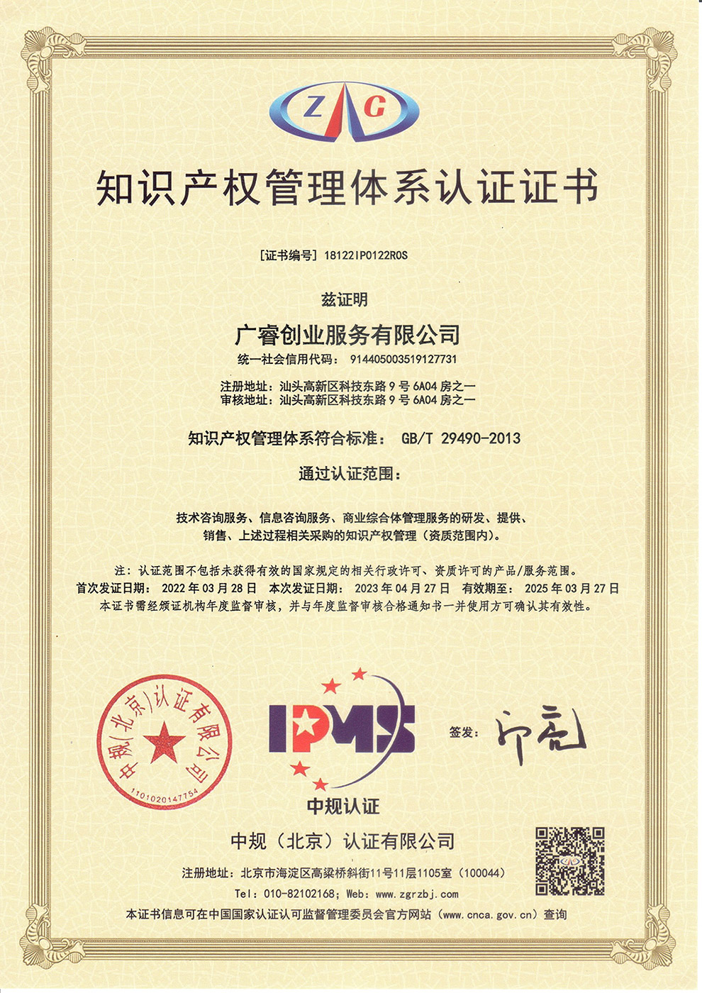 广睿创业服务有限公司是汕头高新区企业,是科技部认定的国家级众创空间,公司注重知识产权创造运用,通过模式创新和技术创新发明了“一种线上线下信息形成连结的方法及技术”,并以此构建基于OAO(Online And Offline)线上线下融合新模式的创业服务体系,为各行业商家提供模式应用和平台支持,帮助商家搭建线上线下识别统一、路径统一、双向引流、全域互联的经营架构,实现线上线下全渠道营销,以新模式、新技术、新服务推动传统商业转型升级,促进线上线下融合发展。2022年3月,经专家评审获得知识产权管理体系认证。